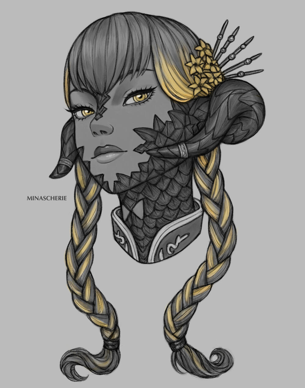 Azimbayar exudes self-assured confidence in everything she does. Challenging and playful, she delights in putting on a performance for others. Life, even in its most difficult moments, is meant to be enjoyed. Singing, drinking, fighting, flirting, and learning are all of equal importance. It is only in the quest to prove herself that the fraying edges of her smug aura can be seen. Behind it is a deep longing, and an urge to justify the divine presence in her life.